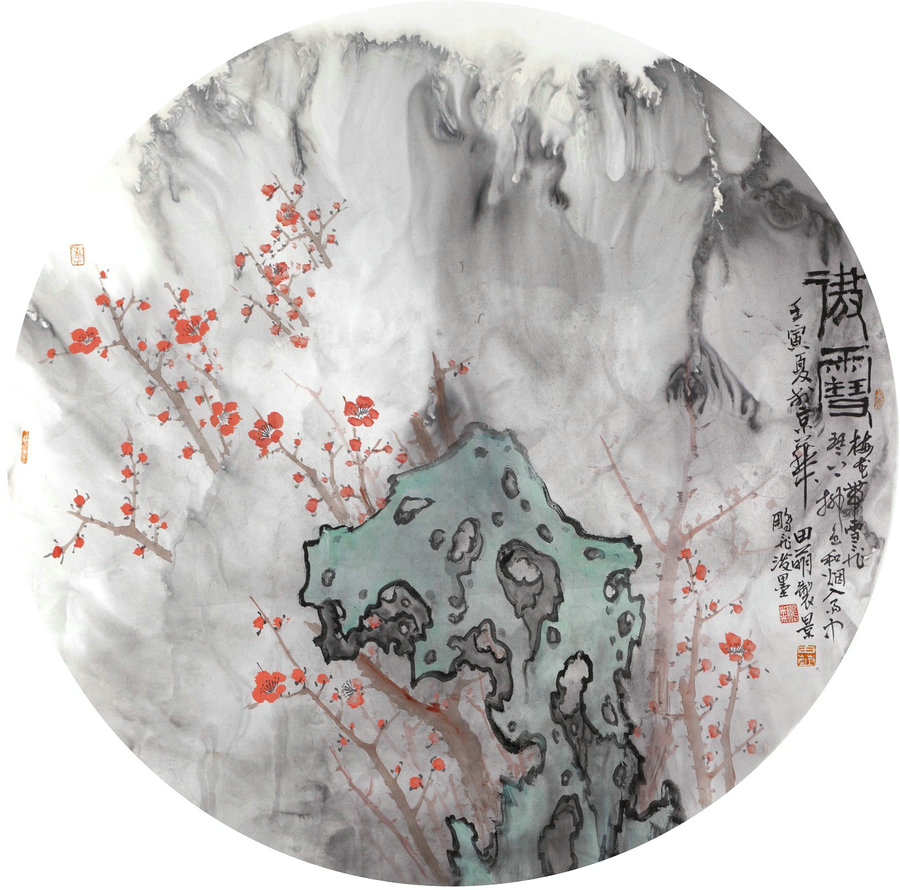 He Pengfei's exhibition at Yanhuang Art Museum shows paintings inspired by Saluwusu culture and works he co-produces with friends. [Photo provided to China Daily]