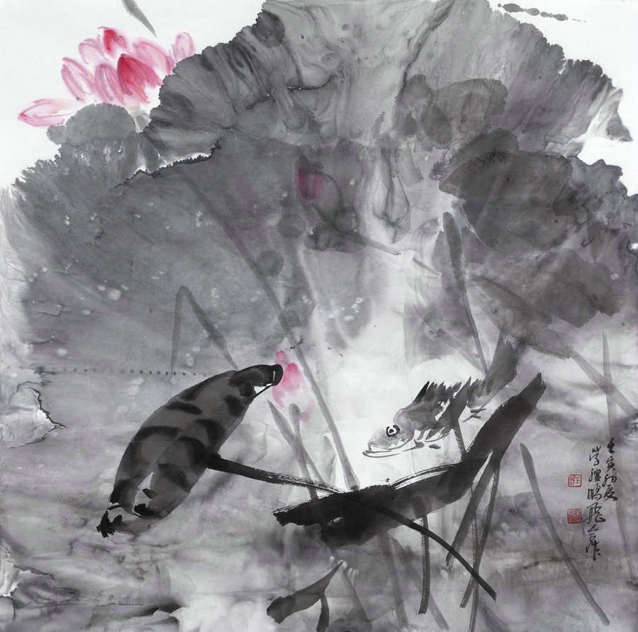 He Pengfei's exhibition at Yanhuang Art Museum shows paintings inspired by Saluwusu culture and works he co-produces with friends. [Photo provided to China Daily]