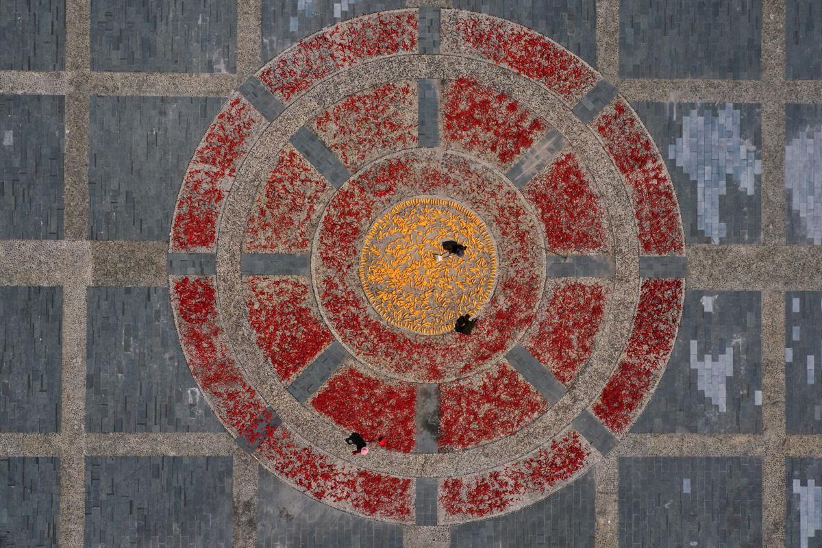 Drying crops in autumn is a time-honored practice in many Chinese villages during harvest time. Farmers dry agricultural produce in their yards in front of houses or on rooftops. The variety of colors on the ground adds to the splendor of the harvest season.