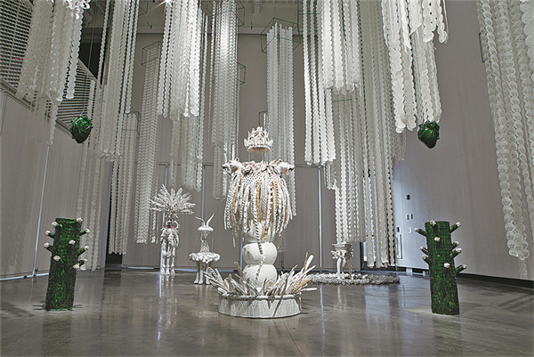 She hung soft sculptures made from white paper from the ceiling, surrounding the white standing ceramic sculptures.