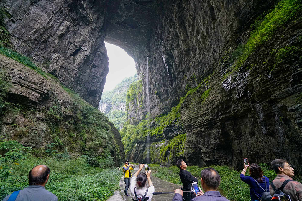 Wulong Karst Tourism Area, located in Chongqing’s Wulong district, has unique karst landscapes including caves, sinkholes, fractures, canyons, peaks, and alpine meadows. It is divided into three sections: the Three Natural Bridges, the Fairy Mountain, and the Furong Cave. Designated a national top level travel destination, the tourism area also impresses visitors with distinctive folk customs of the Tujia, Miao, and Mulam ethnic groups.