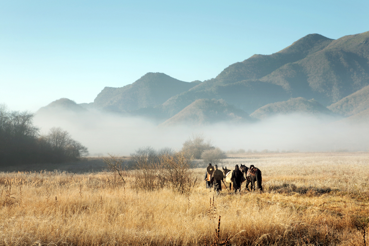 The film’s finale was shot in Dajiu Lake Wetland Park. Nie Yinniang (played by Shu Qi) kept her promise to return to the village to meet the mirror polisher (played by Satoshi Tsumabuki) and the elderly man who harvests herbs (played by Shih Chun). She embarks on her way to escort the mirror polisher for the kingdom of Silla. They go over the vast plains of the Dajiu Lake Wetland Park, surrounded by the breathtaking backdrop of an azure sky, withered grass, and mist drifting above waters.