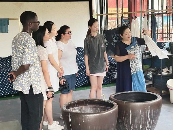 A new-generation practitioner of Anting Yaoban Cloth, displays how to make the clothes to students. [Photo/WeChat ID: StudyatSHU]