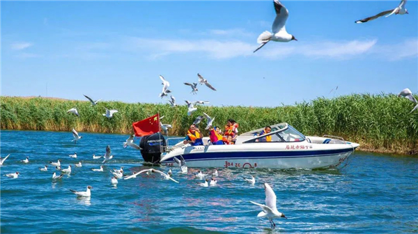 A flock of birds rests in Alshaa League's wetlands. [Photo/Alshaa League Release]