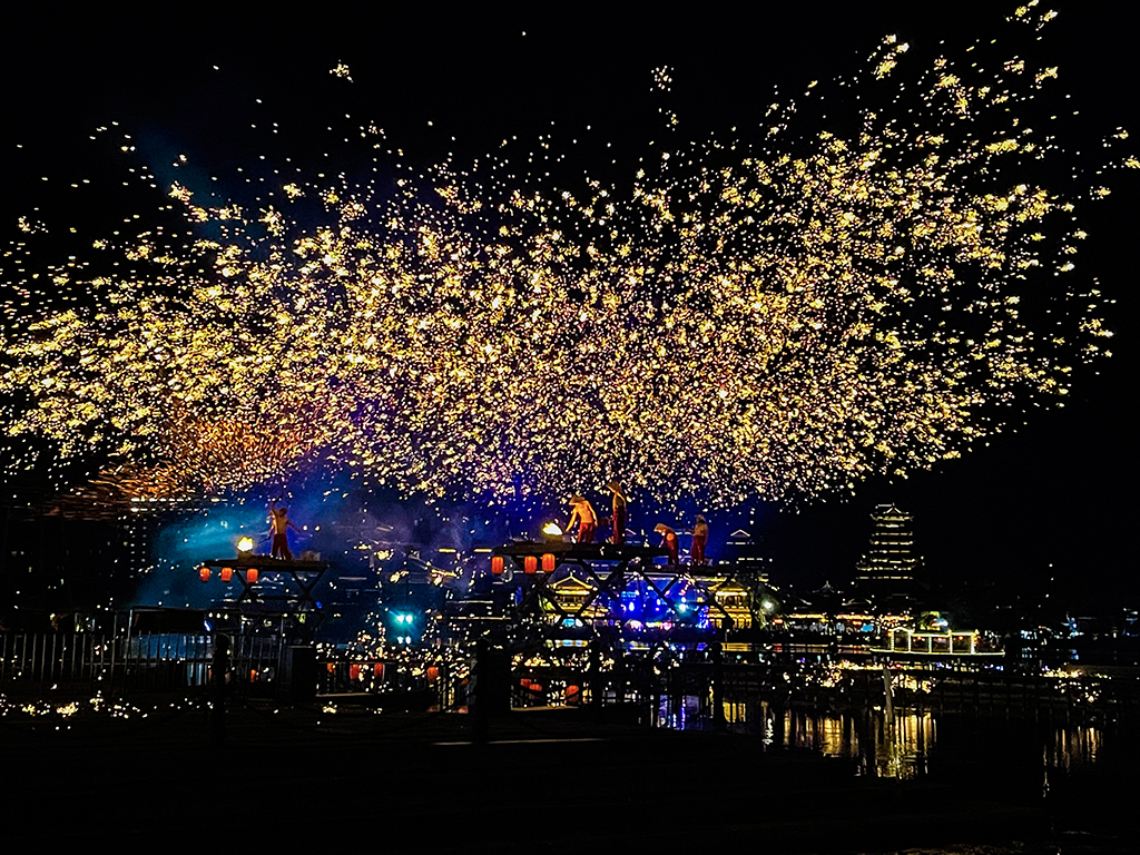 The molten iron fireworks show lights up the night sky in Guanyao ancient town, Changsha, Hunan province. [Photo/IC]
