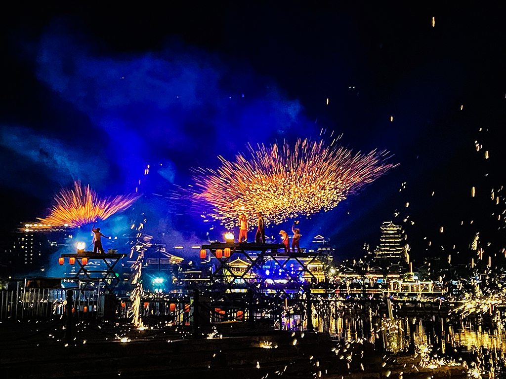 The molten iron fireworks show lights up the night sky in Guanyao ancient town, Changsha, Hunan province. [Photo/IC]