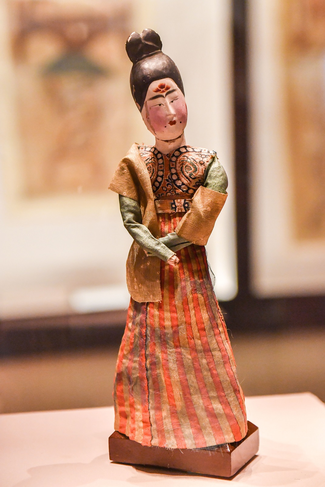As the only Tang Dynasty figure wearing clothes found so far, it is carved out of wood, has paper arms and silk clothes. Its painted face also presents the make-up from more than 1,000 years ago. The impact of Central Plain culture can also be seen by the figure’s exquisite design.