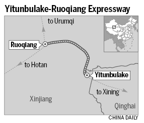 The 294-kilometer expressway, with a designed speed of 120 km/h, is located in Ruoqiang county of Bayingolin Mongol autonomous prefecture, and allows vehicles to enter Xinjiang from Yitunbulake on their way to multiple cities in southern Xinjiang, such as Ruoqiang, Qiemo, Hotan and Kashgar.