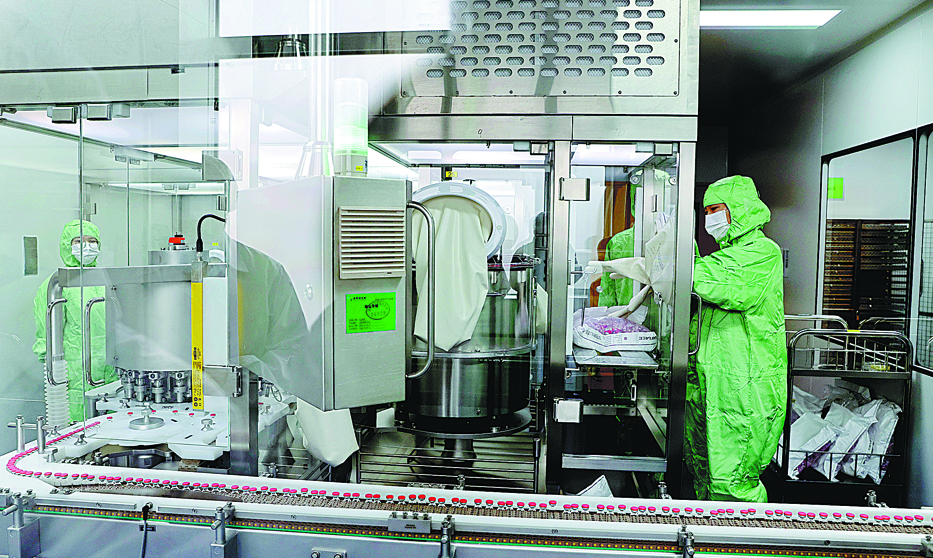 Employees work on a vaccine production line of CanSino in Tianjin. [Photo by FENG YONGBIN/CHINA DAILY]