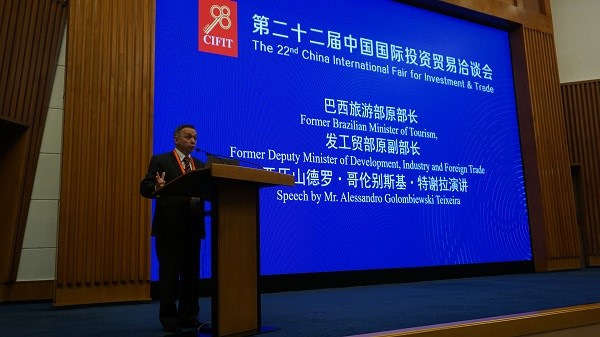 Alessandro Golombiewski Teixerira, former Brazilian Minister of Tourism, stresses the importance of investment for developing countries in a speech to the conference. [Photo by Jin Yongxue/chinadaily.com.cn]