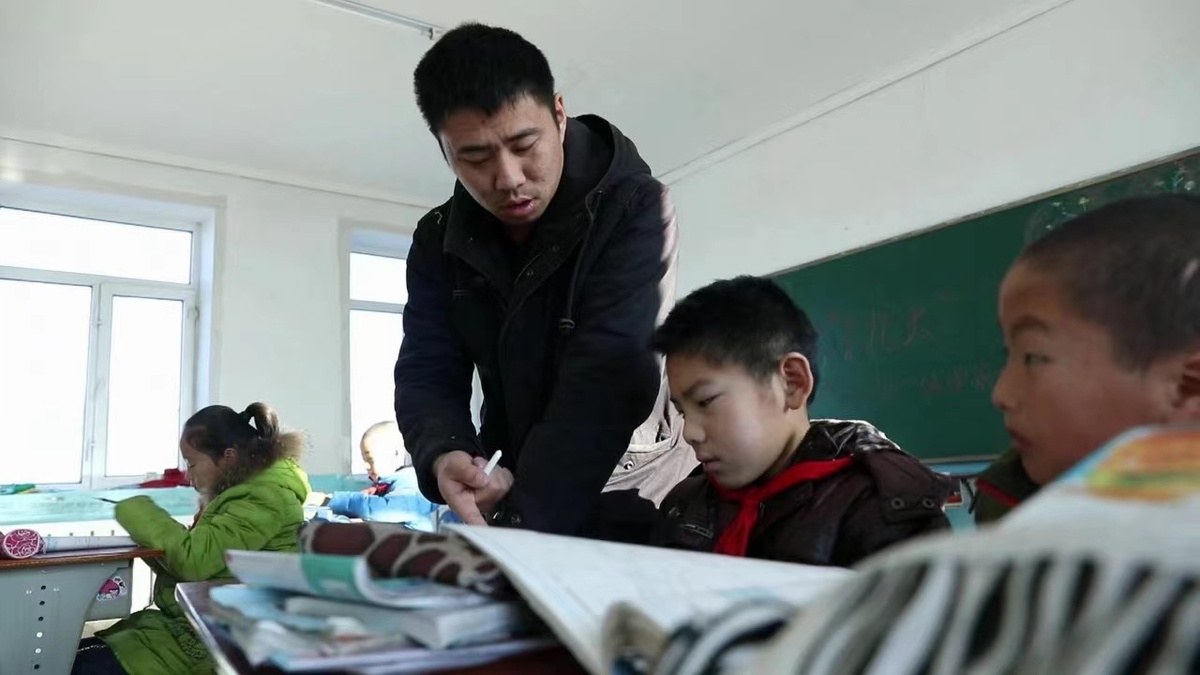 Teacher Wang Zhonglei answers questions asked by his students in Beihong village. [Photo provided to chinadaily.com.cn]