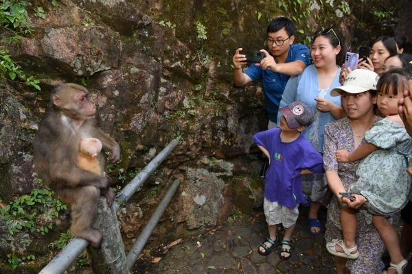 Tourists observe Tibetan macaques at Wuyi Mountain National Park in Fujian province. [Photo by Jiang Kehong/Provided to chinadaily.com.cn]