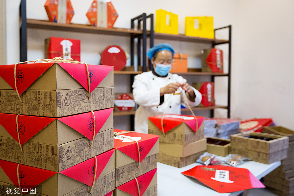 A worker packs moon cakes in a food factory in Anyang, Henan province, on Sept 3, 2022. [Photo/VCG]