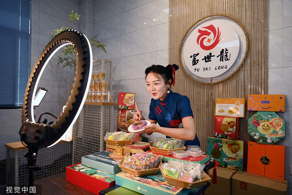 A saleswoman promotes moon cakes via a livestream in Yichun, Jiangxi province, on Sept 6, 2022. [Photo/VCG]