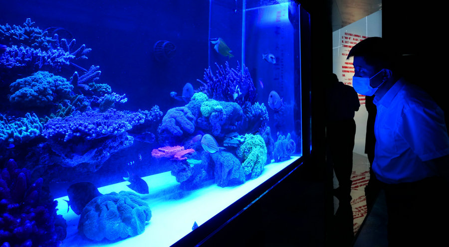 A visitor looks at a coral exhibit in Sanya in May. Corals cultivated by the institute can be used as both tourism and medical resources. [Photo by Zhang Mao/China Daily]