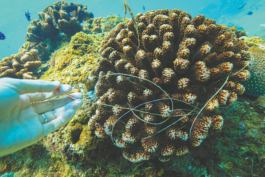A diver removes a thread of broken fishing net from coral reefs in May, 2017. [Photo by Zhang Mao/China Daily]