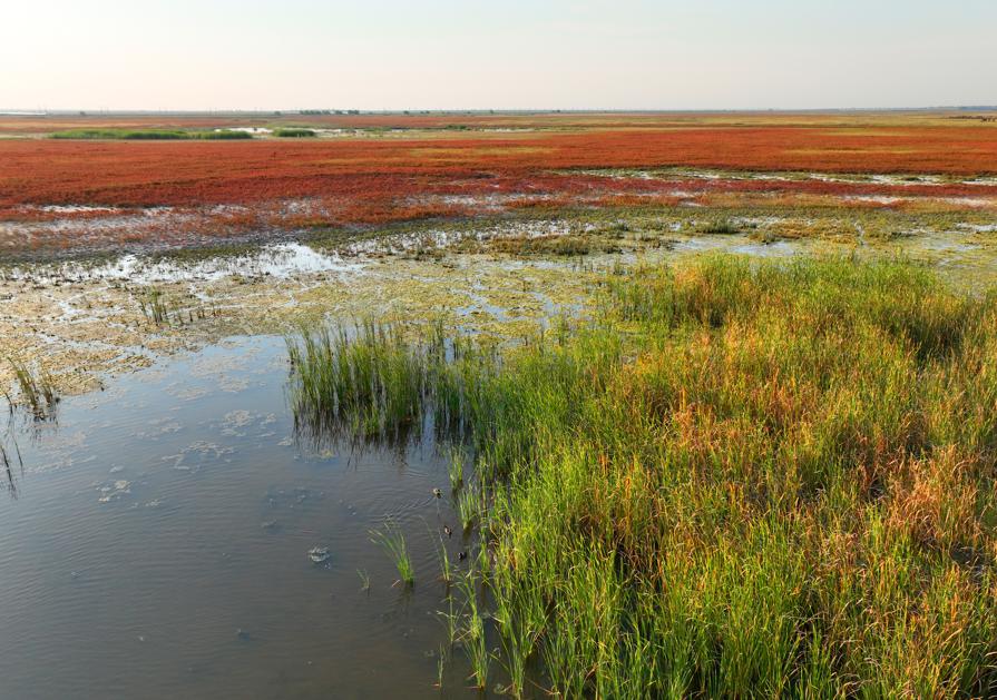 When viewed from the air, the wetland might be mistaken for a color palette, as the red weeds grow together with some green plants, including reeds and cattails.