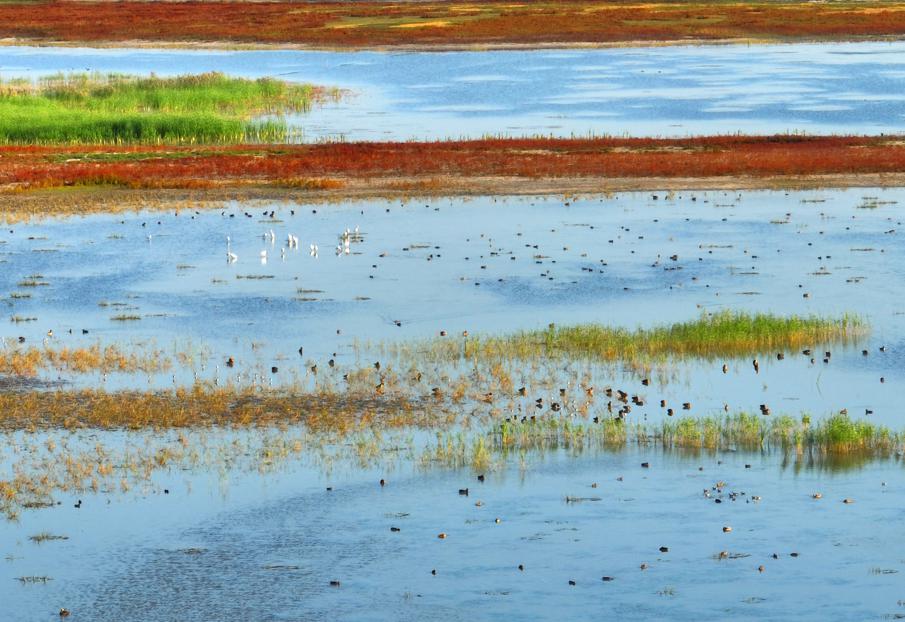 Flocks of birds, such as white cranes and wild ducks have been seen flying or seeking food in the wetlands, forming a harmonious ecological landscape.