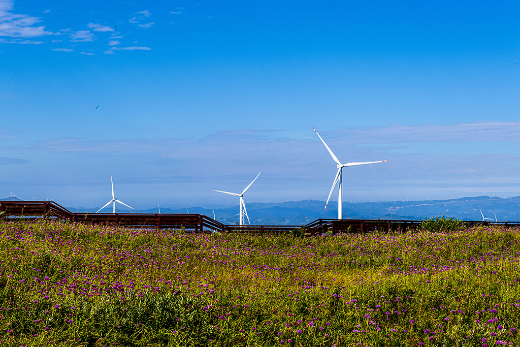 Purple garlic chives flowers complement the power-generating windmills in the Jiucaiping scenic area in Bijie, Southwest China’s Guizhou province. [Photo/IC]