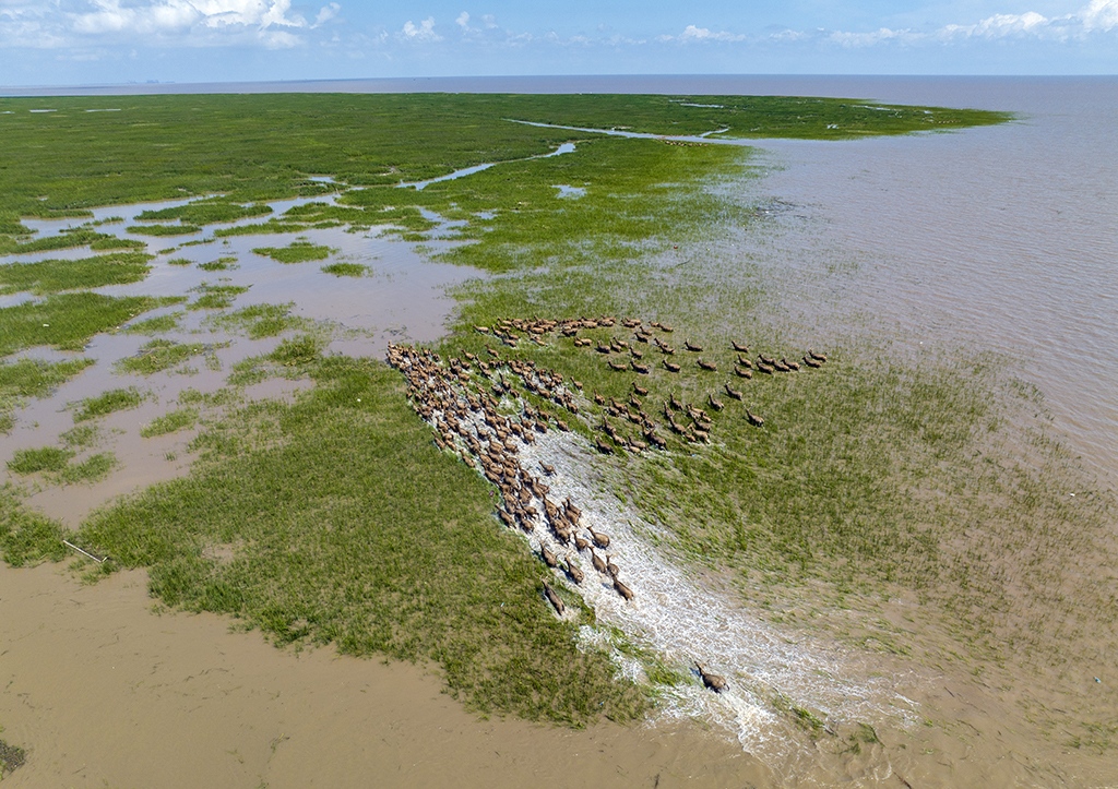 The Huanghai Wetland in Yancheng, Jiangsu province is a world heritage site and is a habitat of migratory birds in the Yellow (Bohai) Sea (Phase I). With the improvement of local wetland environment, it recently drew herds of milu deer to the site to forage for food.
