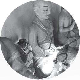 The interior of the gate was festooned with cobwebs, side walls were covered in mud, and water was leaking everywhere. As Zhang stepped into Great Buddha's Hall, a huge cloud of dust suddenly rose, and she had to wear a face mask to check the condition of the Buddha statues.