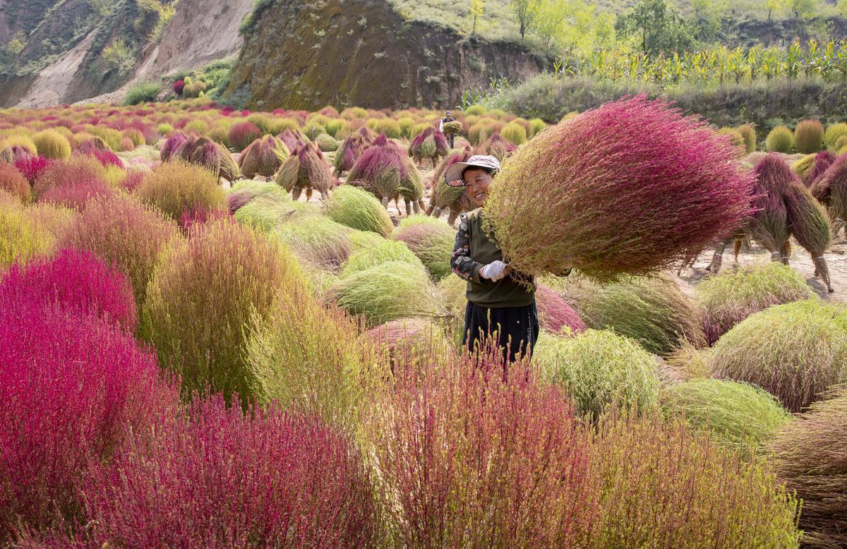 In the golden days of autumn, farmers in Caojiagou village of Liulin county, Shanxi province, are welcoming this year's bumper harvest of fireweed, or kochia Scoparia.
