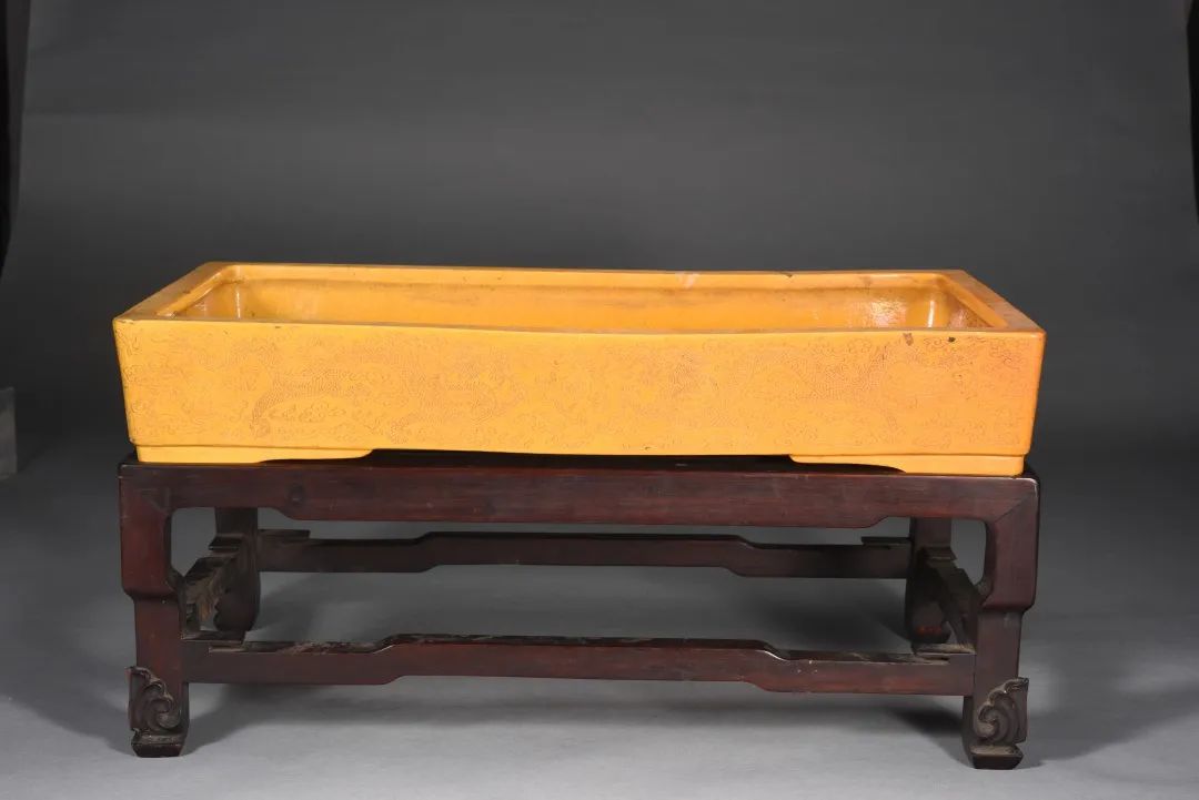 Yellow-glazed flower pot carved with double dragons chasing a pearl, Qing Dynasty, from the collection of the Wuhan Museum [Photo/Official WeChat account of the Wuhan Museum]