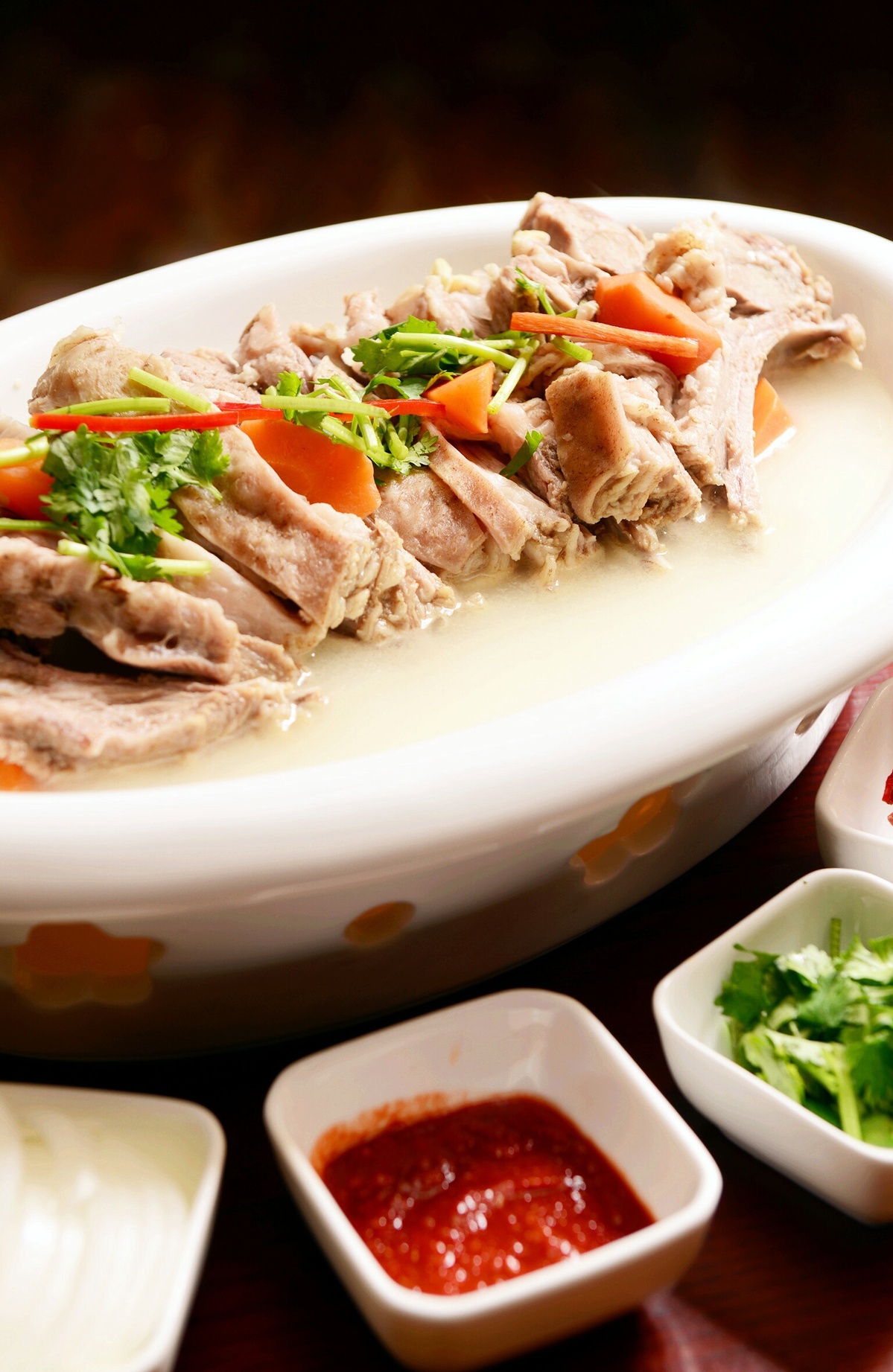 Fat and tender mutton is boiled with salt. When eating, one hand holds the mutton and the other hand uses a knife to cut the meat, which is succulent and flavorsome.