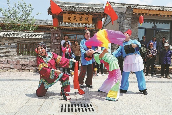 Villagers stage a local opera in front of a homestay for tourists in Songjiagou village in Kelan county, Shanxi. [ZHAO WENJUN/FOR CHINA DAILY]