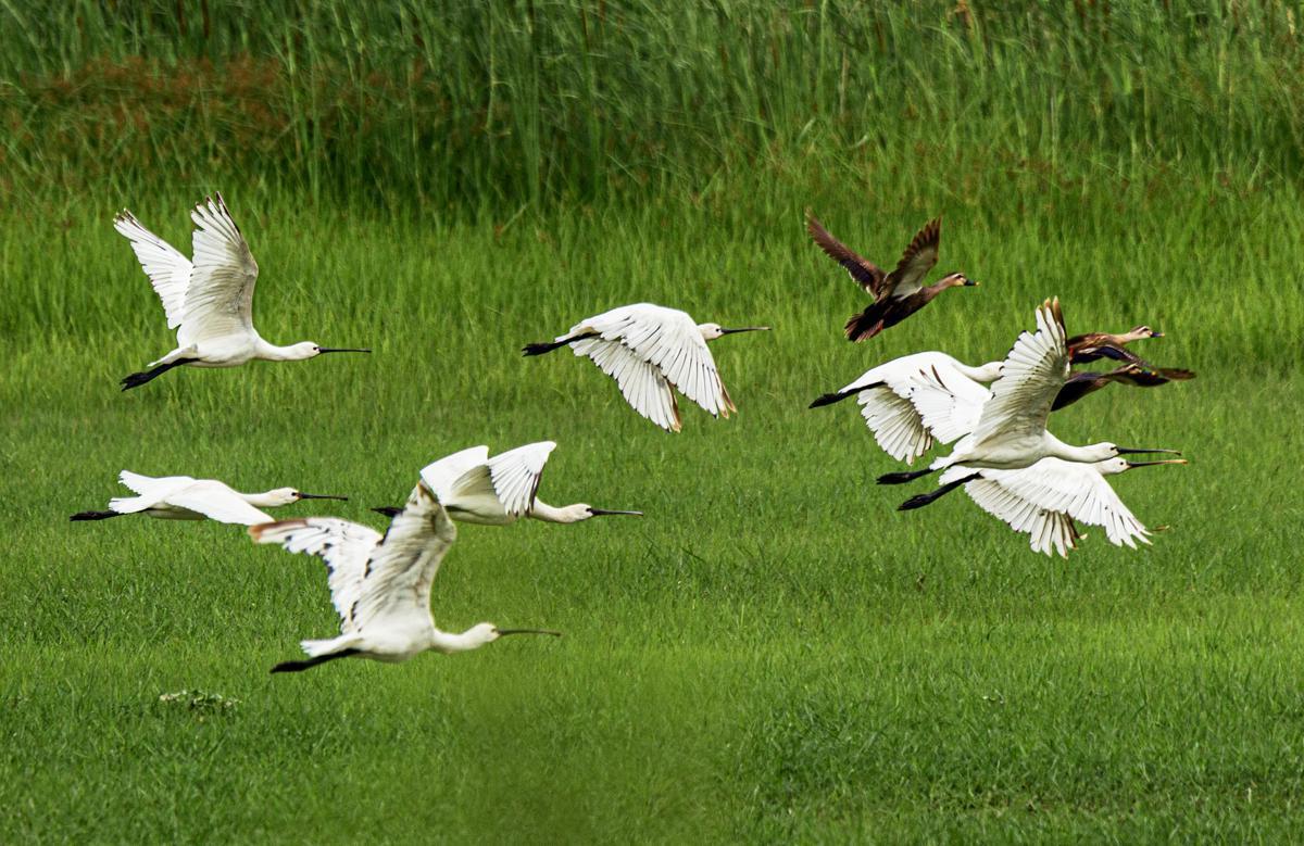 White spoonbills fly over the Yanghe wetland in Xuanhua district, Zhangjiakou, Hebei province, on Saturday. [Photo by Chen Xiaodong/For chinadaily.com.cn]