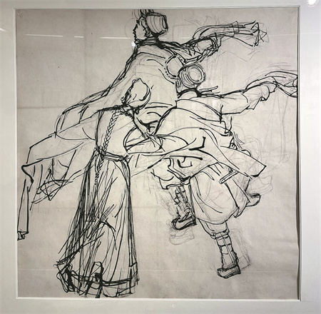 On show are dozens of drafts he drew for The Liberation of Beiping, an ink-color painting that depicts a joyful scene of people in Beijing welcoming People's Liberation Army troops entering the historical city in 1949. He created the piece in celebration of the 10th anniversary of the founding of the People's Republic of China, and it is now in the collection of the National Museum of China in Beijing.