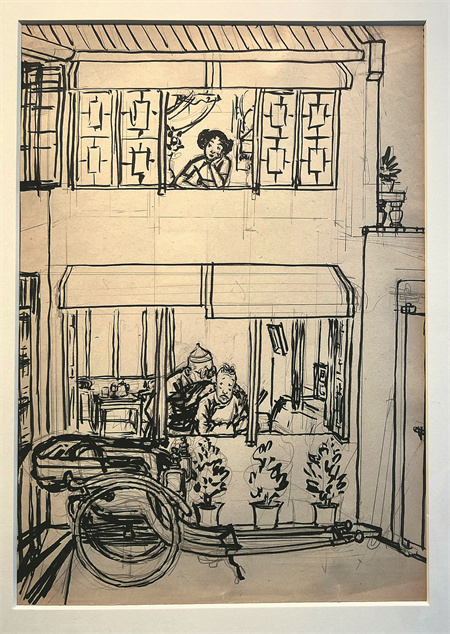 One of the highlights of the current exhibition is a collection of illustrations Ye drew for Ziye (Midnight), a novel authored in 1933 by Mao Dun, who was not just a novelist, but also an essayist and critic, also from Zhejiang province. The novel depicts the modernity and life of the upper class in metropolitan Shanghai, while exposing a social crisis under the influence of colonialism and capitalism.