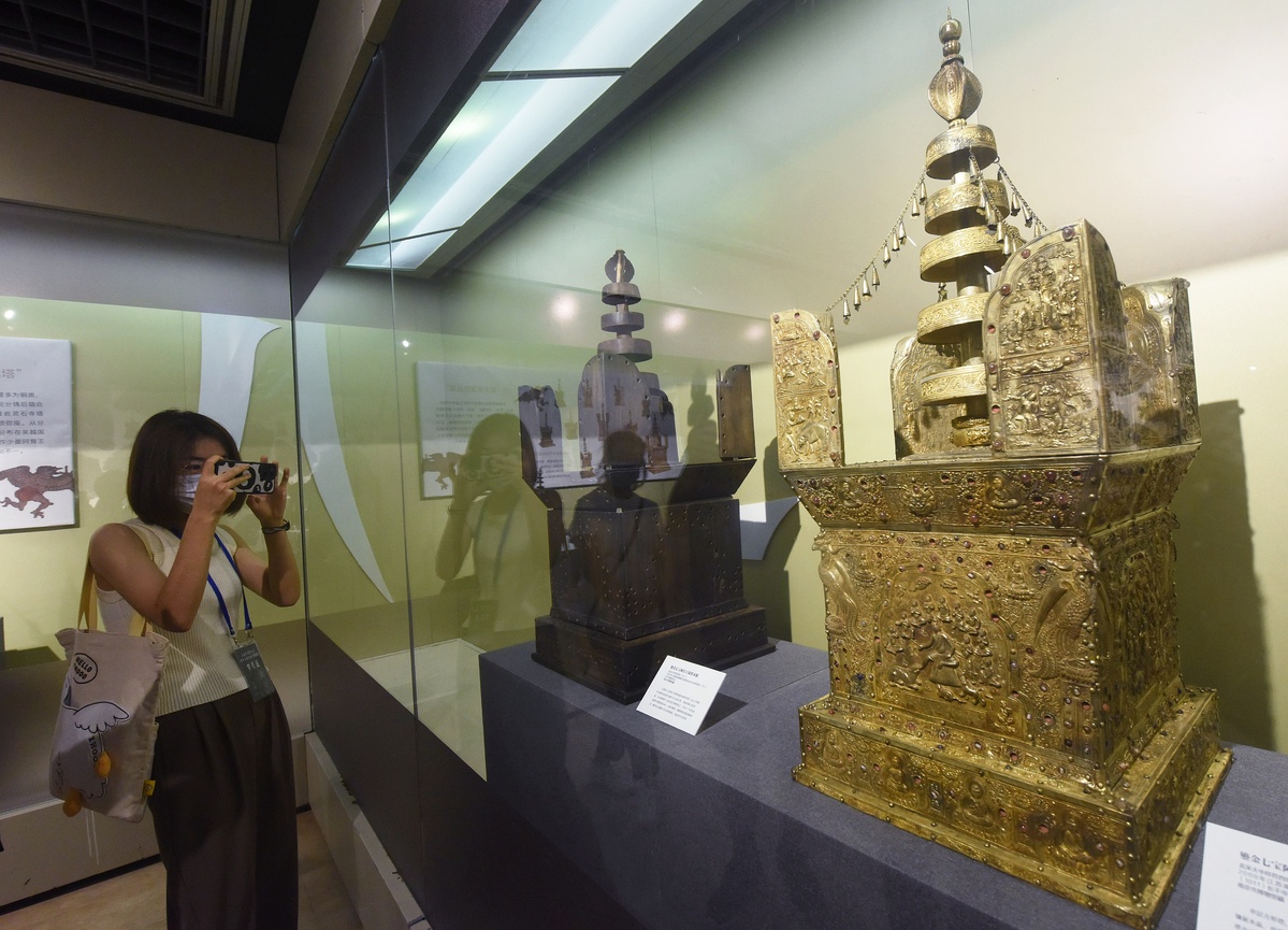 A visitor takes photos of the Northern Song Dynasty (960-1127) gilded silver Ashoka Stupa at the Zhejiang Provincial Museum in Hangzhou. [Photo/VCG]