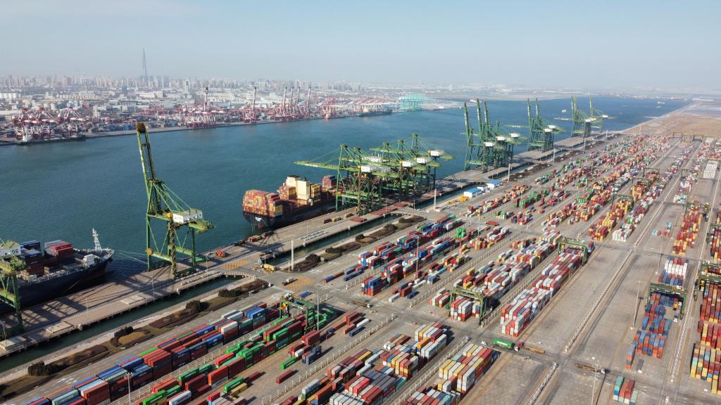 Aerial photo taken on Jan 11, 2021 shows a view of the Pacific international container terminal at Tianjin Port in North China's Tianjin. [Photo/Xinhua]