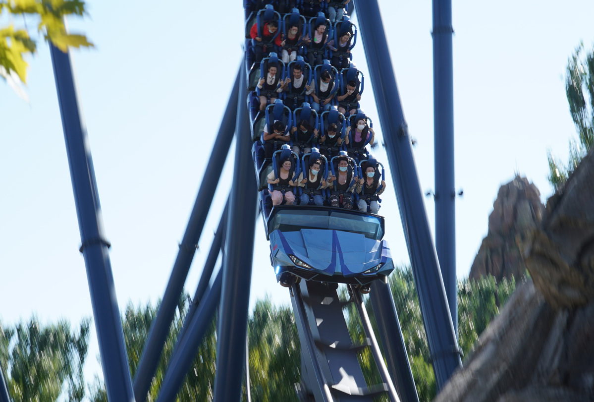Visitors take a roller coaster at the Universal Beijing Resort in Beijing, capital of China, Sept 20, 2022. The Universal Beijing Resort celebrated the one year anniversary of its opening to the public on Tuesday. [Photo/Xinhua]