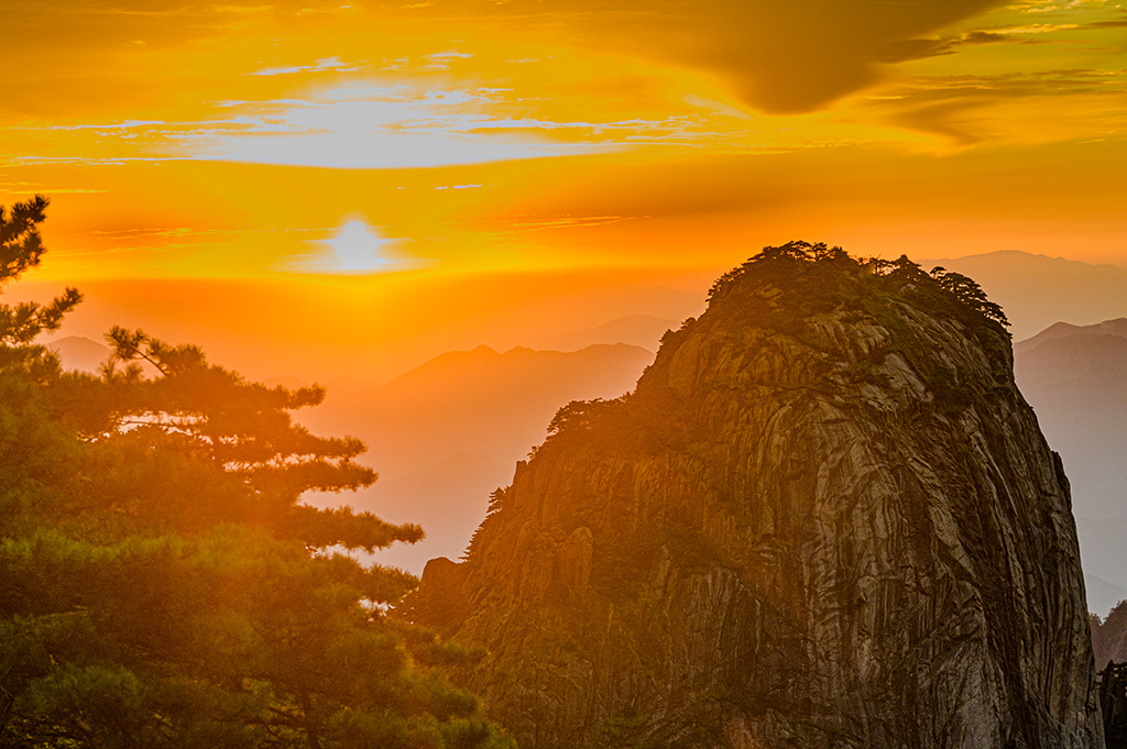Granitic boulders and ancient pine trees around Mount Huangshan in Anhui province look magnificent in the sunrise. [Photo/IC]