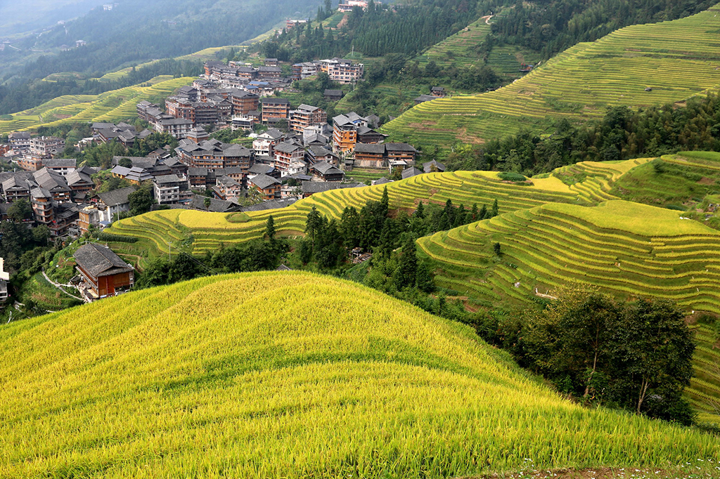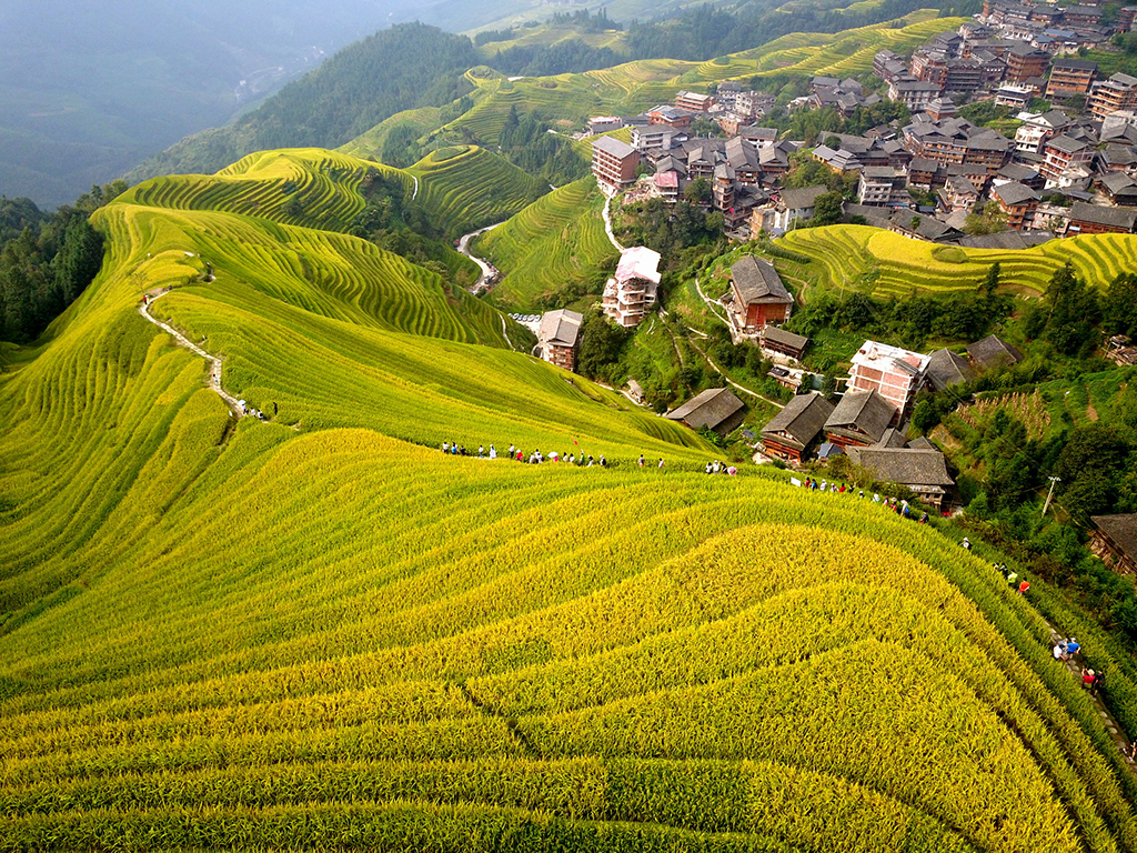 Rolling plants look like golden waves in Longji Ancient Zhuang Village Complex, South China’s Guangxi Zhuang autonomous region. [Photo/IC]