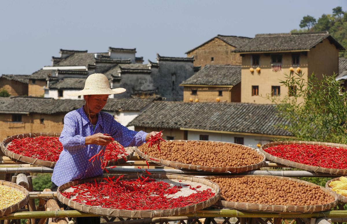 A rural resident puts agricultural produce in the sun to dry. [Photo by Shi Yalei/For chinadaily.com.cn]