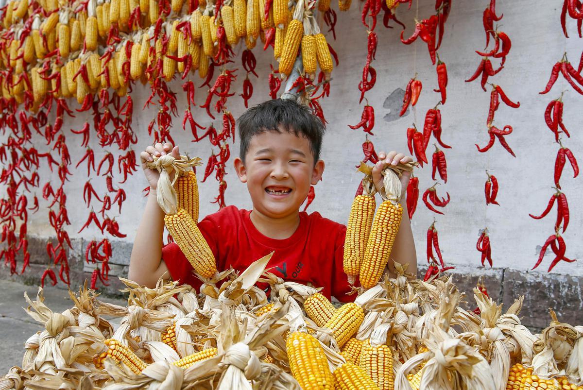 A boy poses for a photo with agricultural produce put in the sun to dry in Chengkan village of Huangshan, Anhui province. [Photo by Shi Yalei/For chinadaily.com.cn]