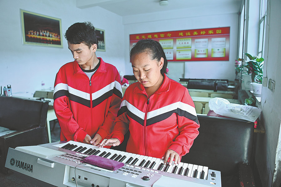 Two members of the troupe practice playing an electric piano in a rehearsal room. [Photo by