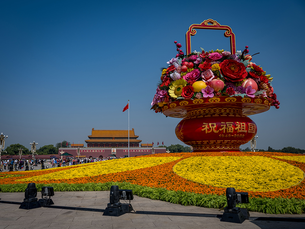 Flowerbeds are set up at Beijing’s Tian’anmen Square to celebrate the National Day holiday. [Photo/IC]