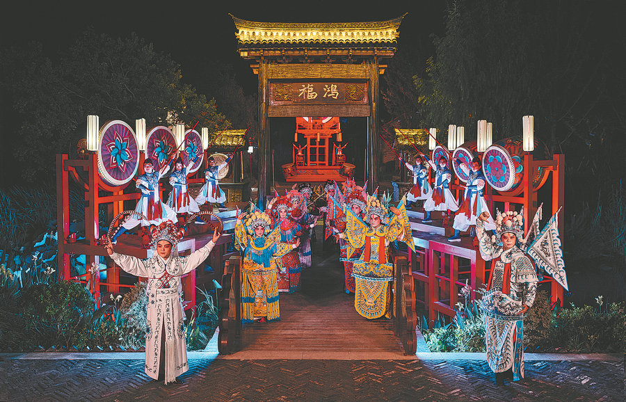 Huaiju Opera actors perform under a memorial archway inside the Jiulongkou Scenic Area. [Photo provided to China Daily]
