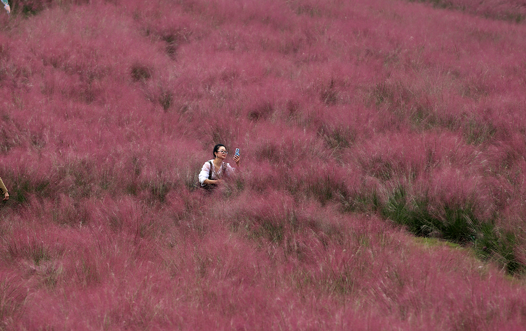 A woman take a photo amid a sea of pink muhly grass in a wetland park in Meishan, Sichuan province. [Photo/IC]