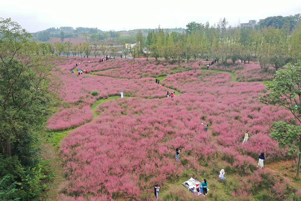 An aerial view of the sea of pink muhly grass in a wetland park in Meishan, Sichuan province [Photo/IC]