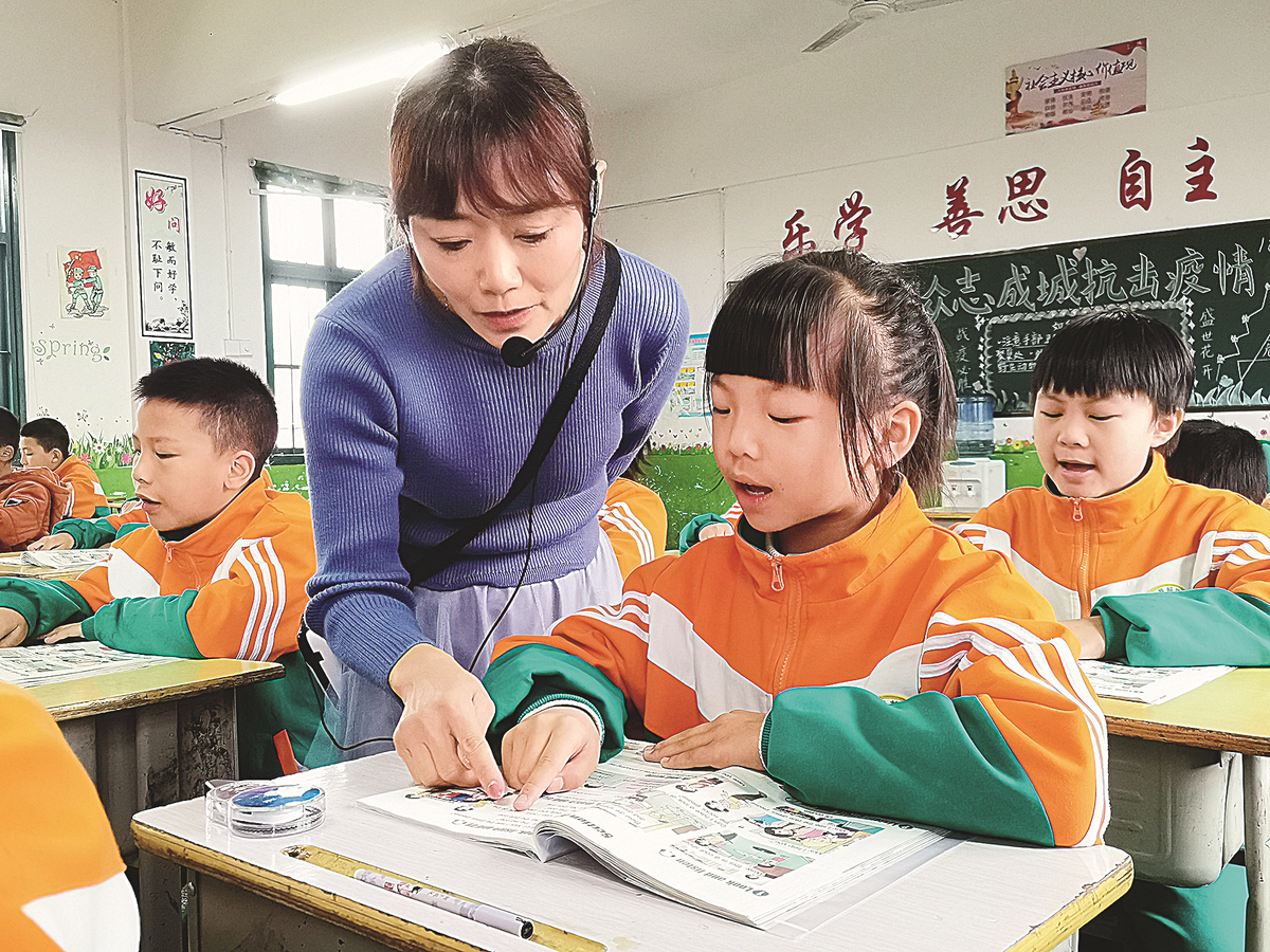 Xu Qiuping, a volunteer teacher, helps a student during an English class at Jiefang Primary School in Xinning county, Hunan province. [Photo/China Daily]