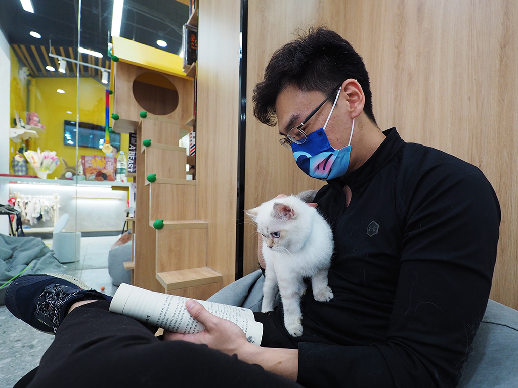A man reads a book with a cat in the first pet-themed Xinhua Bookstore in Beijing. [Photo/IC]