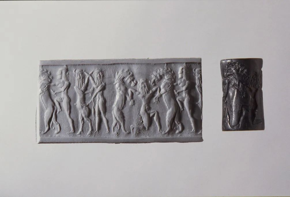 Stone cylinder seal depicting war heroes, Mesopotamia, 22nd century BC [Photo/Official WeChat account of the Anhui Museum]