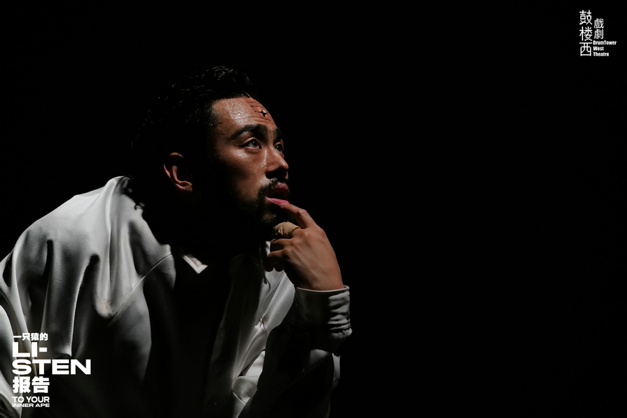 The moment Red Peter, in a black suit with a red bow tie, arrives on the bare, dim stage, his every movement – from crawling to eyebrows scrunching to handshaking with audience members, portrays a creature trapped between apehood and humanity.