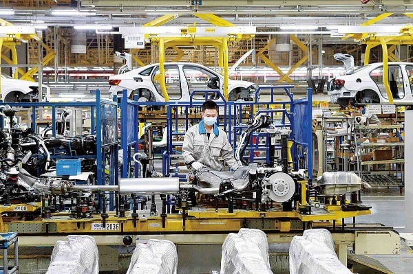 A Volkswagen employee works on an assembly line in Chengdu, Sichuan province, in December. [Photo by WANG QIN/FOR CHINA DAILY]