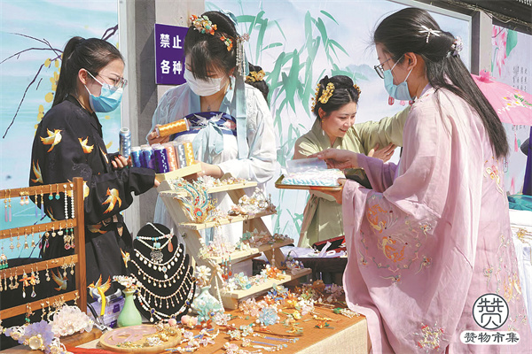 Hanfu lovers exchange experience on making hair clasps at the second hand hanfu market in Beijing in April. [Photo provided to China Daily]